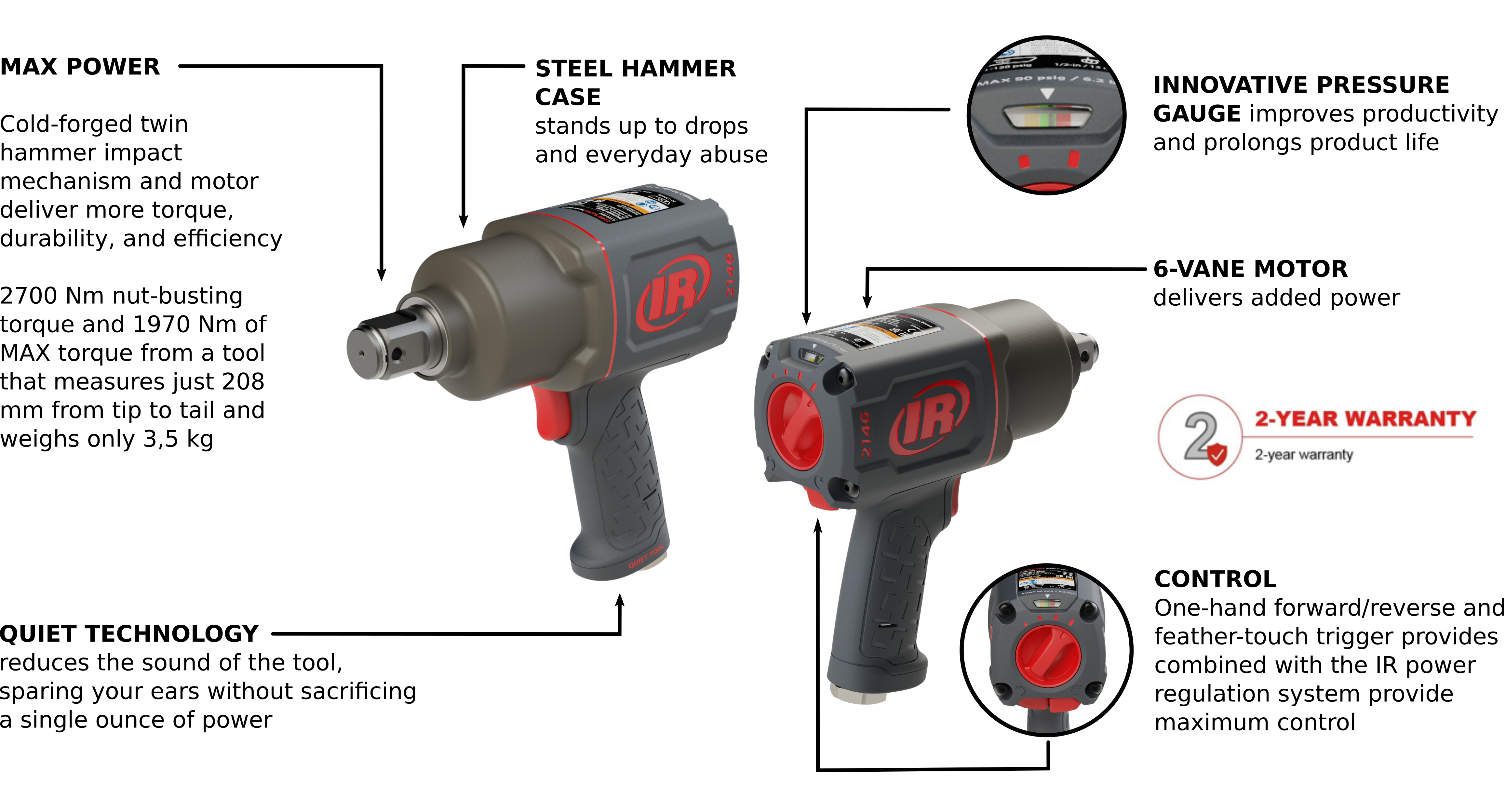 • Ingersoll Rand’s Quiet Technology reduces the sound of the tool, sparing your ears without sacrificing a single ounce of power